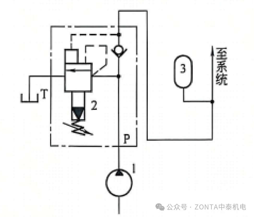 1一泵;2-卸荷溢流閥;3-蓄能器