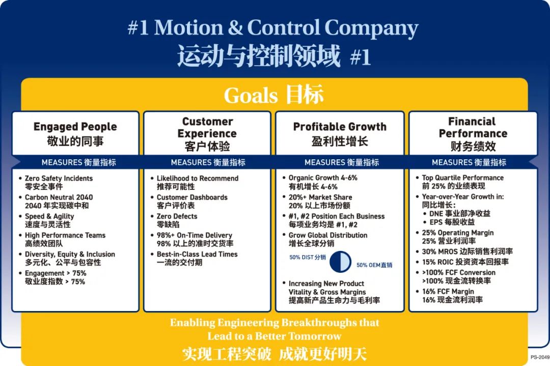 派克以“制勝戰(zhàn)略”各項目標為核心,尋找在文化上和戰(zhàn)略上高度一致的合作對象?!爸苿賾?zhàn)略”是派克全球業(yè)務的價值系統(tǒng),代表著全球員工統(tǒng)一的戰(zhàn)略愿景。“制勝戰(zhàn)略”以派克的文化、價值觀和宗旨為錨點,定義了各項運營重點和考察指標,用于推動團隊成員的敬業(yè)度、提升客戶體驗、促進盈利性增長,優(yōu)化財務績效。
