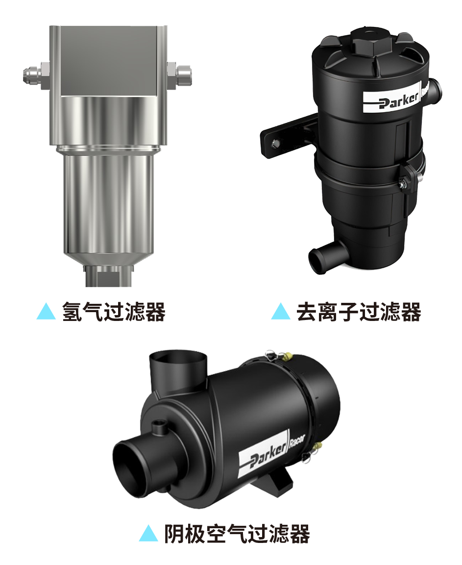 質(zhì)子交換膜燃料電池對(duì)氫氣及空氣的清潔度和流量控制要求非常高,不但微小顆粒的過(guò)濾精度要優(yōu)于燃油發(fā)動(dòng)機(jī)要求,同時(shí)對(duì)酸、堿、氨、VOCs等為代表的有害物質(zhì)也有著嚴(yán)格的過(guò)濾要求。派克漢尼汾針對(duì)這一獨(dú)特需求,研發(fā)推出的氫氣過(guò)濾器可有效去除氫氣氣流中的顆粒和液體,保障進(jìn)入電堆反應(yīng)的氫氣清潔度;而推出的陰極空氣過(guò)濾器則可去除空氣氣流中的雜質(zhì)顆粒和有害氣體。此外,離子交換器可以將冷卻液中的電導(dǎo)率降至理想水平,保護(hù)并延長(zhǎng)燃料電池壽命。