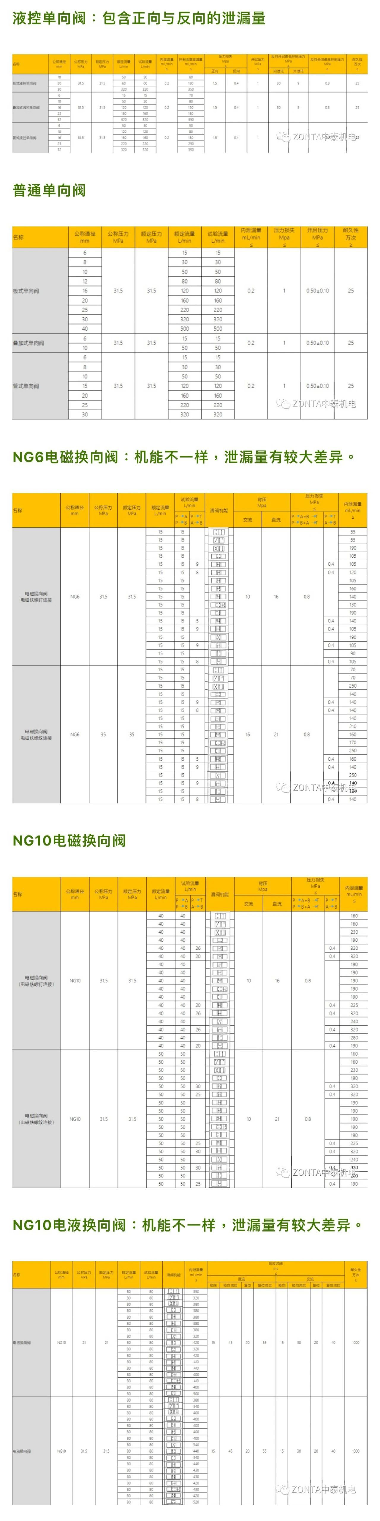 對(duì)常用的液壓閥,如液控單向閥、普通單向閥、電磁換向閥、電液換向閥、溢流閥、調(diào)速閥、減壓閥等的內(nèi)泄漏/外泄漏進(jìn)行了統(tǒng)計(jì),這些參數(shù)可以作為系統(tǒng)工程師在設(shè)計(jì)系統(tǒng)時(shí)候的參考。需要說(shuō)明的是,這些僅僅是行業(yè)標(biāo)準(zhǔn)規(guī)定的,其具有一定的測(cè)試條件,具體品牌或產(chǎn)品的數(shù)值肯定會(huì)有不一樣,應(yīng)該高于該指標(biāo)值才行。